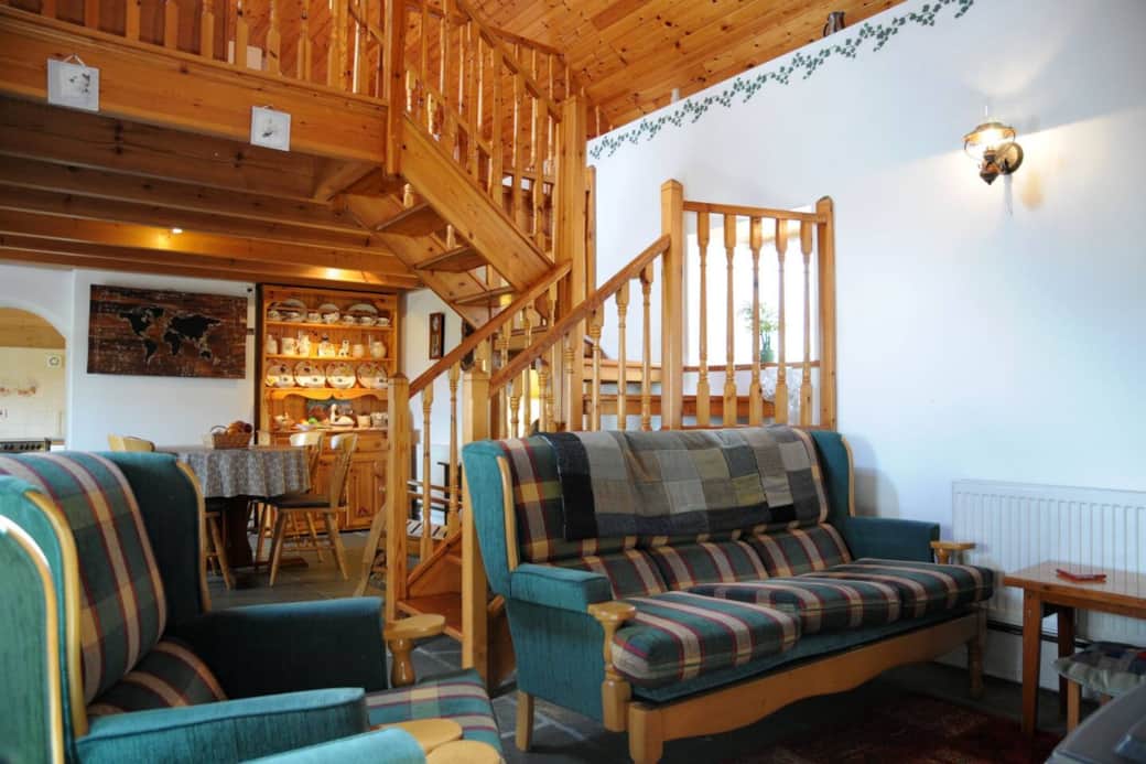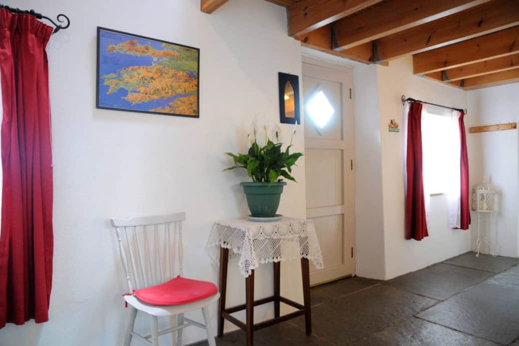 The cottage, which was renovated from a stone ruin over 10 years ago, has all the charm of an old farm cottage with the conveniences of a modern home. The main room consists of a large open space with a low ceiling over one half, which forms the dining area. The other half is a double height space consisting of a sitting area in front of the fireplace with wood burning stove. The bedroom is accessed by a door next to the sitting area. This double height room with a king sized bed is the master bedroom. The stairs from the main room takes you to an open half-loft/mezzanine on which there are two more beds; 1 single and 1 double.